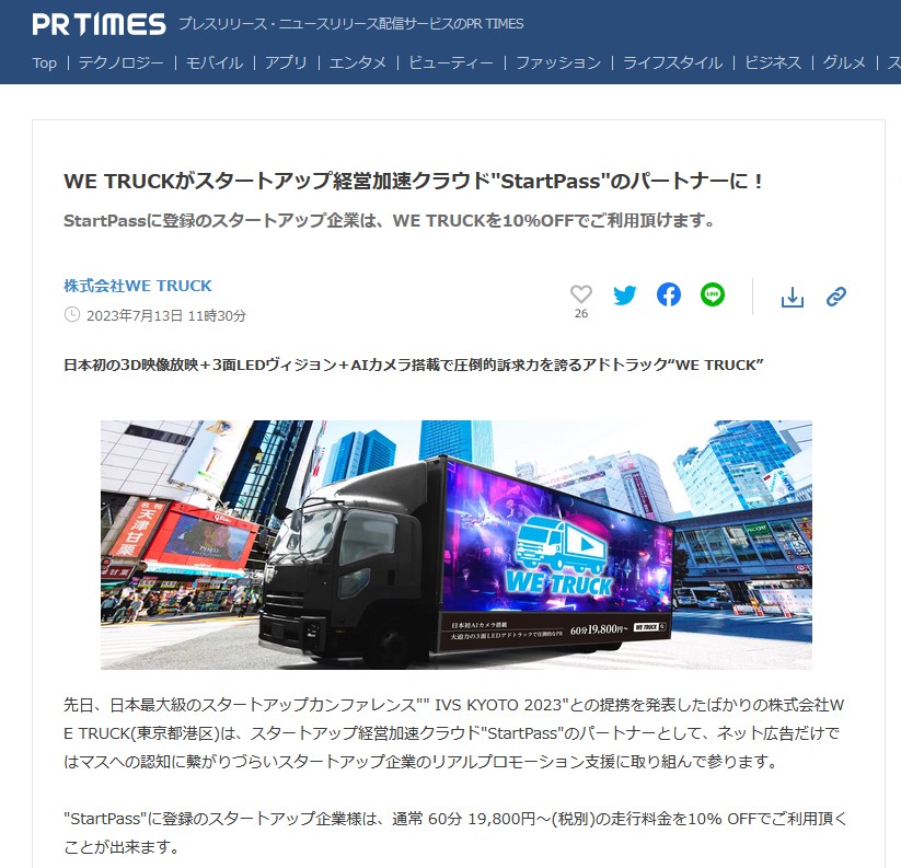 StartPassに登録のスタートアップ企業は、WE TRUCKを10%OFFでご利用頂けます。